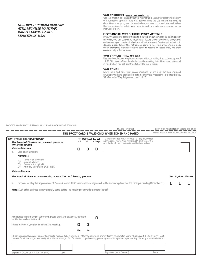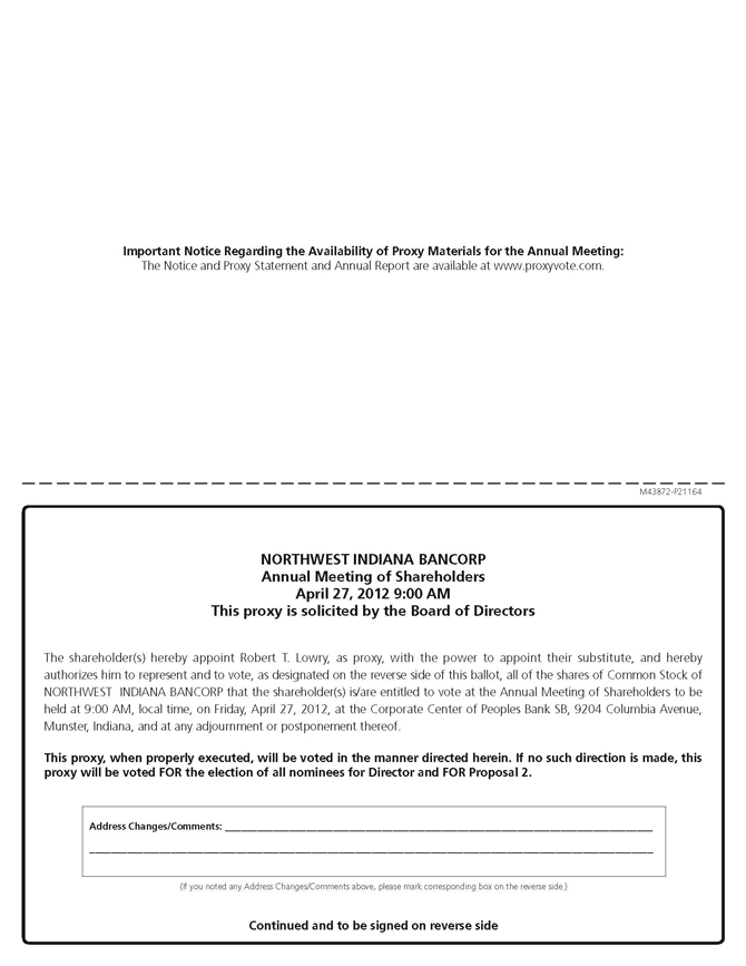 The Annual Meeting of Shareholders of NorthWest Indiana Bancorp will be held at the Corporate Center of Peoples Bank SB, 9204 Columbia Avenue, Munster, Indiana, on Friday, April 27, 2012, at 9:00 a.m., local time.