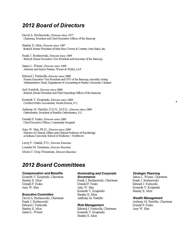 2012 will be remembered as a noteworthy year for banking as our economy recovers from the effects of the Great Recession. The outlook has brightened for Northwest Indiana as job losses stabilized with some jobs returning in the manufacturing sector, although not at the pace that would hasten the recovery. Other positive signs include an upswing in housing prices, the strengthening of exports, and consumer households shedding record high debt and returning to their lowest levels since 1993.