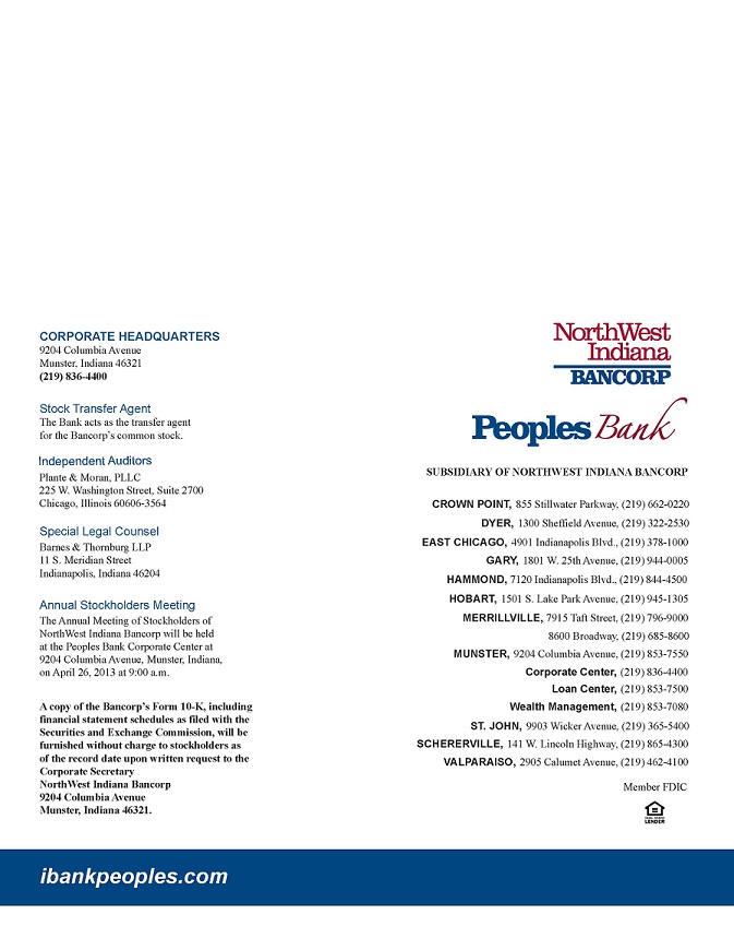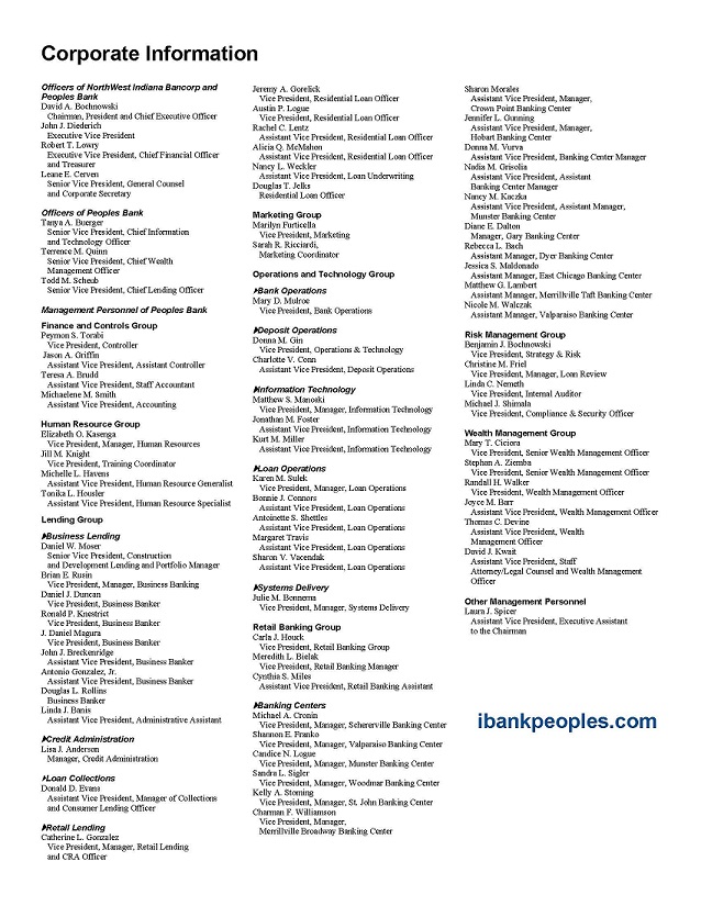 As the economy recovers, the Bancorp and our operating subsidiary, Peoples Bank, are well positioned to meet the challenges of our industry, just as we have been able to overcome the challenges of the recent past. Your Board of Directors and the entire Peoples team are cautiously optimistic about the future and bullish on the prospect of doing business in Northwest Indiana.