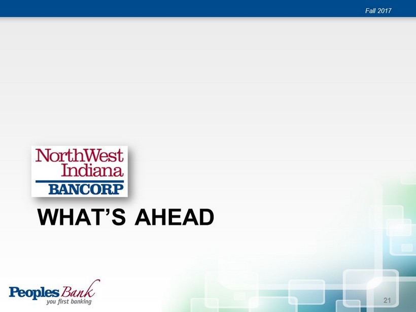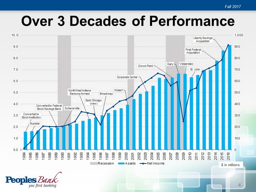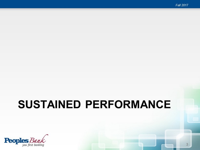 Forward Looking Statements Fall 2017 “Forward - looking statements” as defined in the Private Securities Litigation Reform Act of 1995 may be included in this release. A variety of factors could cause the Bancorp’s actual results to differ from those expected at the time of this release. These include, but are not limited to, changes in economic conditions in the Bancorp’s market area, changes in policies by regulatory agencies, fluctuation in interest rates, demand for loans in the Bancorp’s market area, economic conditions in the financial services industry, the Bancorp’s ability to successfully integrate the operations of recently acquired institutions, competition and other risks set forth in the Bancorp’s reports filed with the Securities and Exchange Commission, including its Annual Report on Form 10 - K for the year ended December 31, 2016. Readers are urged to carefully review and consider the various disclosures made by the Bancorp in its periodic reports filed with the Securities and Exchange Commission. Forward - looking statements speak only as of the date they are made, and the Bancorp undertakes no obligation to update them in light of new information or future events. 2