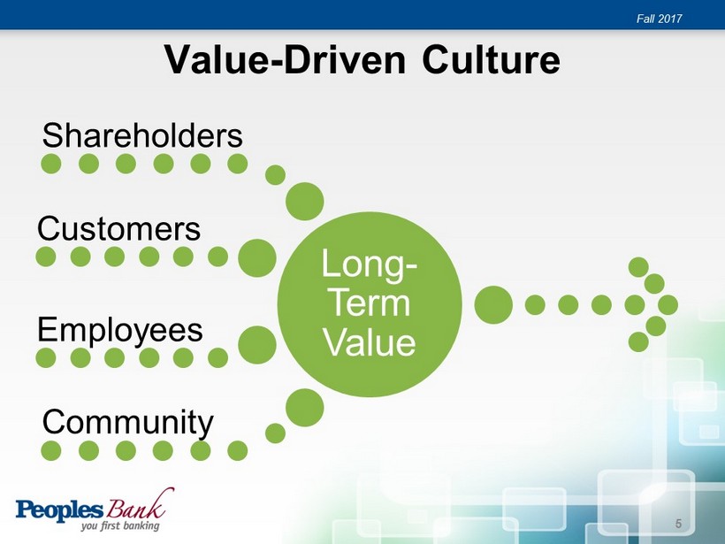 Over 3 Decades of Performance Fall 2017 Converted to Stock Institution Munster Converted to Federal Stock Savings Bank Schererville NorthWest Indiana Bancorp formed East Chicago (new) Broadway Hobart Corporate Center Crown Point Gary Valparaiso St. John First Federal Acquisition Liberty Savings Acquisition 0 100 200 300 400 500 600 700 800 900 1,000 0.0 1.0 2.0 3.0 4.0 5.0 6.0 7.0 8.0 9.0 10.0 1984 1985 1986 1987 1988 1989 1990 1991 1992 1993 1994 1995 1996 1997 1998 1999 2000 2001 2002 2003 2004 2005 2006 2007 2008 2009 2010 2011 2012 2013 2014 2015 2016 Recession Assets Net Income $ in millions 4