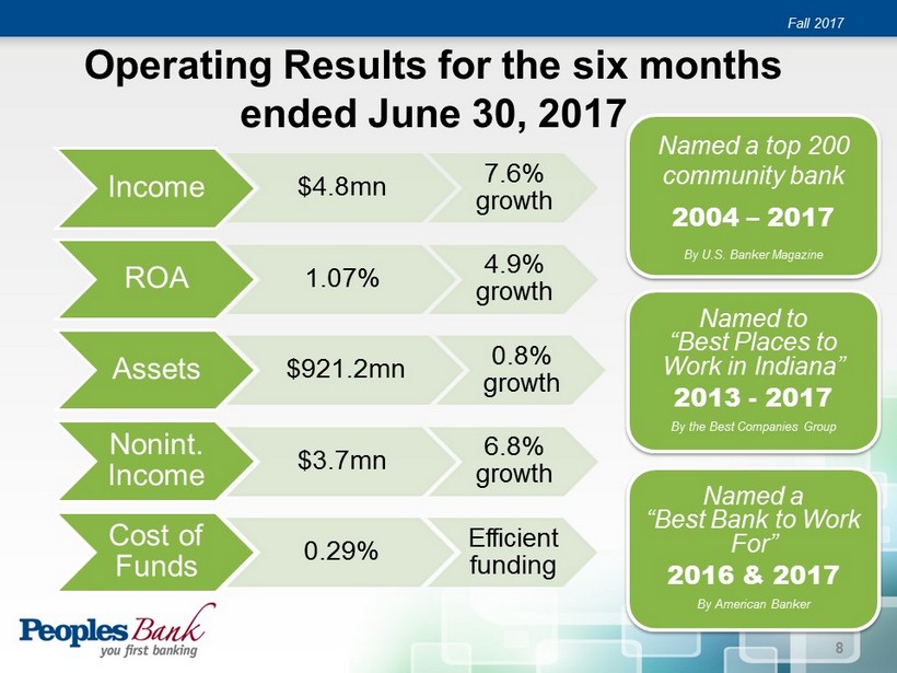 2017 Performance Summary Increased Earnings through June 30, 2017 • Net income totaled $4.8mn, 7.6% growth over 2016 for the six months ended June 30, 2017 Strong, stable asset quality • Non - performing loans at 1.06% of total loans Assets and capital continue to grow • Total assets at $921.2mn, an increase of $7.6mn, 0.8%; Tier 1 capital well positioned for continued growth Enhanced the sales team • Added new mortgage lending manager, a banking center manager and a business banker Fall 2017 7