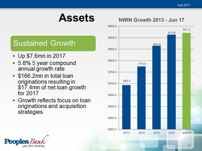 Operating Results for the six months ended June 30, 2017 Income $4.8mn 7.6% growth ROA 1.07% 4.9% growth Assets $921.2mn 0.8% growth Nonint. Income $3.7mn 6.8% growth Cost of Funds 0.29% Efficient funding Fall 2017 Named to “Best Places to Work in Indiana” 2013 - 2017 By the Best Companies Group Named a top 200 community bank 2004 – 2017 By U.S. Banker Magazine Named a “Best Bank to Work F or” 2016 & 2017 By American Banker 8