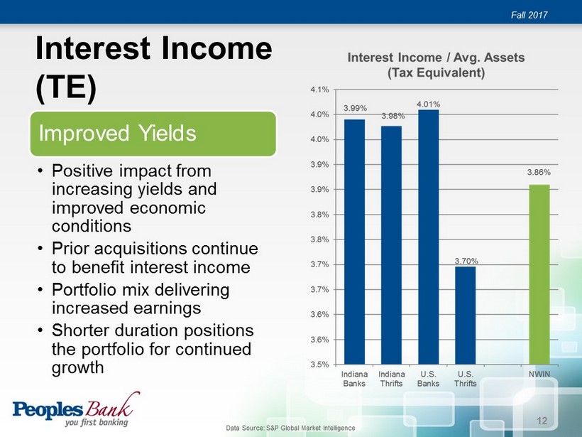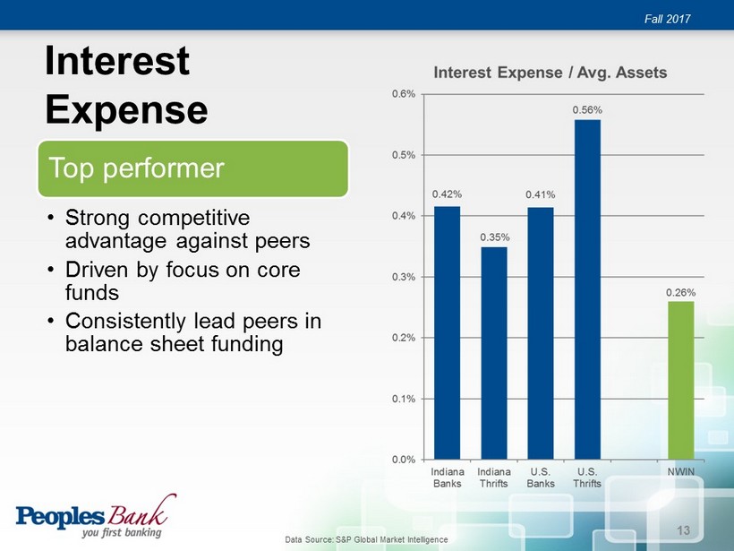 Interest Income (TE) Fall 2017 Improved Yields • Positive impact from increasing yields and improved economic conditions • Prior acquisitions continue to benefit interest income • Portfolio mix delivering increased earnings • Shorter duration positions the portfolio for continued growth 12 Data Source: S&P Global Market Intelligence