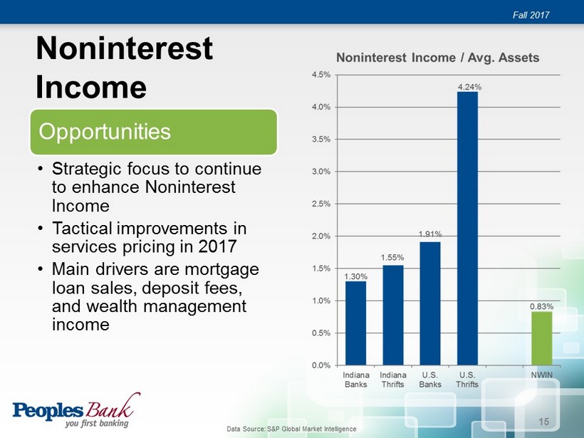 Net Interest Margin (TE) Fall 2017 Outperforms peers • Results of strong funding management • Continues to expand as asset yields improve • Main driver of ROA 14 Data Source: S&P Global Market Intelligence