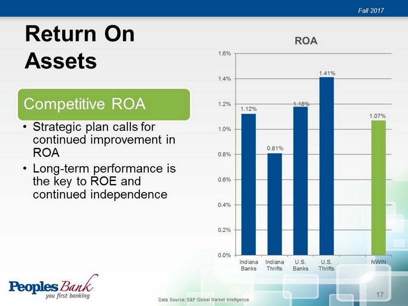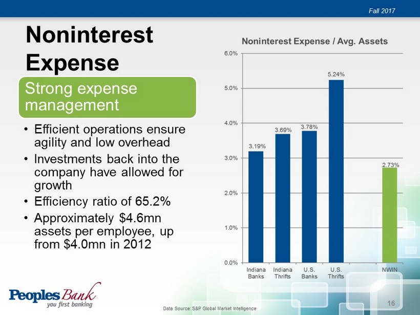 Noninterest Expense Fall 2017 Strong expense management • Efficient operations ensure agility and low overhead • Investments back into the company have allowed for growth • Efficiency ratio of 65.2% • Approximately $4.6mn assets per employee, up from $4.0mn in 2012 16 Data Source: S&P Global Market Intelligence