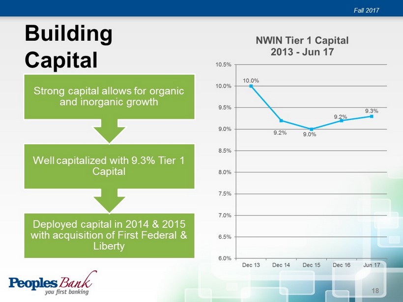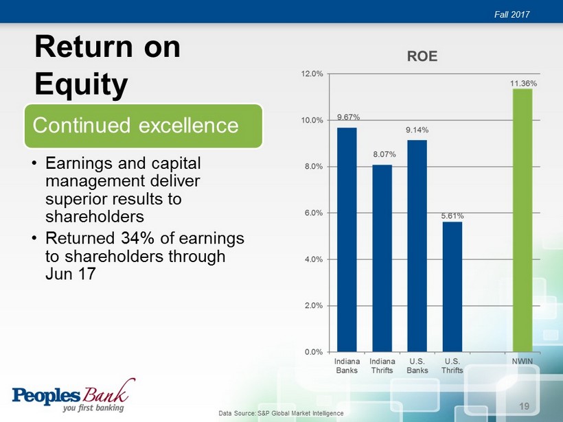 Building Capital Fall 2017 Deployed capital in 2014 & 2015 with acquisition of First Federal & Liberty Well capitalized with 9.3% Tier 1 Capital Strong capital allows for organic and inorganic growth 18