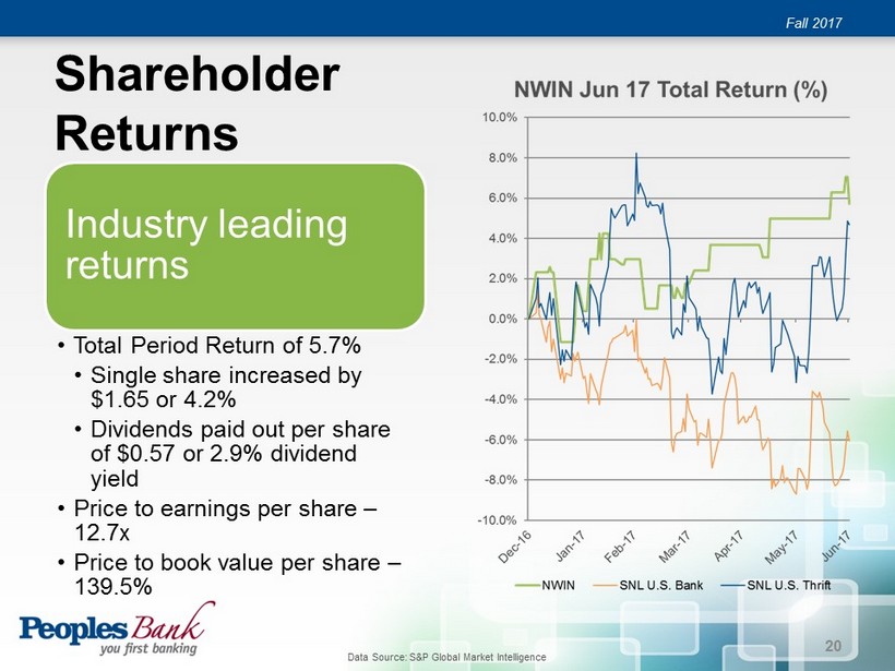 Return on Equity Fall 2017 Continued excellence • Earnings and capital management deliver superior results to shareholders • Returned 34% of earnings to shareholders through Jun 17 19 Data Source: S&P Global Market Intelligence