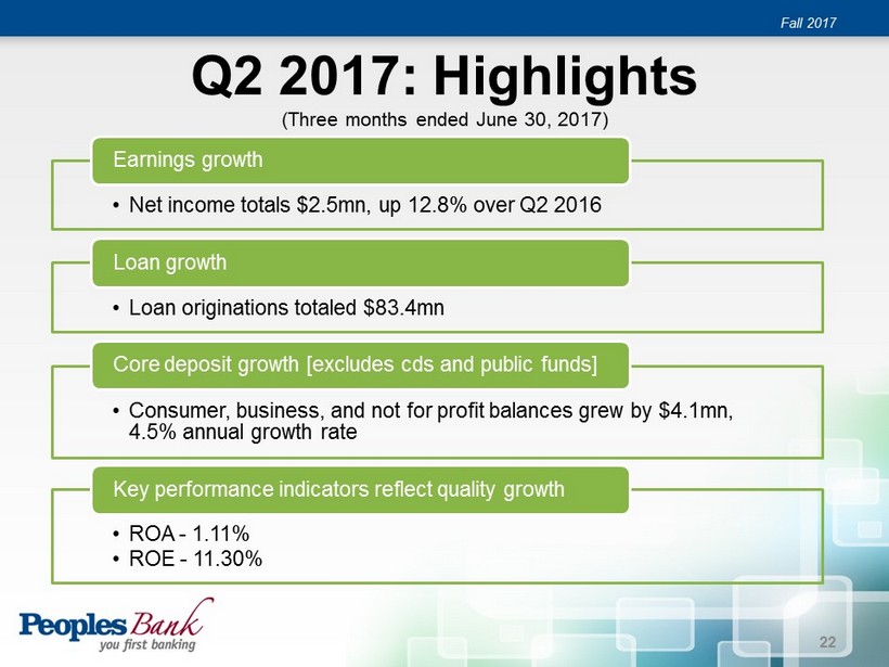 Q2 2017: Highlights (Three months ended June 30, 2017) • Net income totals $2.5mn, up 12.8% over Q2 2016 Earnings growth • Loan originations totaled $83.4mn Loan growth • Consumer, business, and not for profit balances grew by $4.1mn, 4.5% annual growth rate Core deposit growth [excludes cds and public funds] • ROA - 1.11% • ROE - 11.30% Key performance indicators reflect quality growth Fall 2017 22