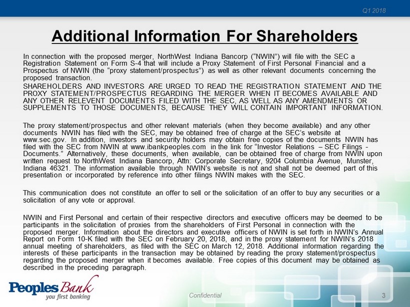 Forward - Looking Statements This presentation may contain forward - looking statements regarding the financial performance, business prospects, growth and operating strategies of NorthWest Indiana Bancorp (“NWIN”), as well as those of First Personal Financial Corp. (“First Personal”), with which NWIN has entered into a previously announced Agreement and Plan of Merger dated February 20, 2018, providing for the proposed merger of First Personal with and into NWIN. For these statements, each of NWIN and First Personal claims the protections of the safe harbor for forward - looking statements contained in the Private Securities Litigation Reform Act of 1995. Statements in this communication should be considered in conjunction with the other information available about NWIN and First Personal, including the information in the filings NWIN makes with the SEC, including its Annual Report on Form 10 - K for the year ended December 31, 2017. Forward - looking statements provide current expectations or forecasts of future events and are not guarantees of future performance. The forward - looking statements are based on management’s expectations and are subject to a number of risks and uncertainties. Forward - looking statements are typically identified by using words such as “anticipate,” “estimate,” “project,” “intend,” “plan,” “believe,” “will” and similar expressions in connection with any discussion of future operating or financial performance. Although management believes that the expectations reflected in such forward - looking statements are reasonable, actual results may differ materially from those expressed or implied in such statements. Risks and uncertainties that could cause actual results to differ materially include: ability to obtain regulatory approvals and meet other closing conditions to the merger, including approval by First Personal’s shareholders; delay in closing the merger; difficulties and delays in integrating NWIN’s and First Personal’s businesses or fully realizing cost savings and other benefits; business disruption following the merger; changes in asset quality and credit risk; the inability to sustain revenue and earnings growth; changes in interest rates and capital markets; inflation; customer acceptance of NWIN’s and First Personal’s products and services; customer borrowing, repayment, investment, and deposit practices; customer disintermediation; the introduction, withdrawal, success, and timing of business initiatives; competitive conditions; the inability to realize cost savings or revenues or to implement integration plans and other consequences associated with mergers, acquisitions, and divestitures; economic conditions; and the impact, extent, and timing of technological changes, capital management activities, and other actions of the Federal Reserve Board and legislative and regulatory actions and reforms. Confidential Q1 2018 2