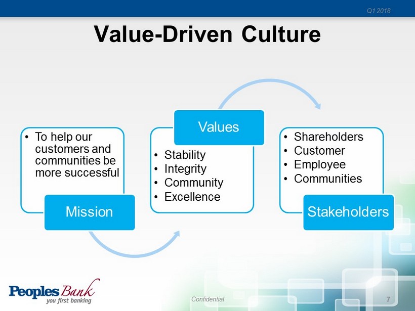 Value - Driven Culture • To help our customers and communities be more successful Mission • Stability • Integrity • Community • Excellence Values • Shareholders • Customer • Employee • Communities Stakeholders Confidential Q1 2018 7