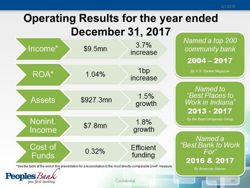 2017 Performance Summary Tax reform • Non - GAAP income* at $9.5, 3.7% increase over 2016 (without tax legislation impact) • Net income totaled $9.0mn, 2.0% decrease from 2016 when considering tax legislation • Expected benefits going forward Asset quality • Strong, stable loan portfolio • Non - performing loans at 0.84% of total loans Growth • Total assets at $927.3mn, an increase of $13.7mn, 1.5% • Tier 1 capital well positioned for continued growth Sales • Added bankers to the Mortgage, Commercial, and Retail areas of the Bank Confidential Q1 2018 * See the table at the end of this presentation for a reconciliation to the most directly - comparable GAAP measure . 10
