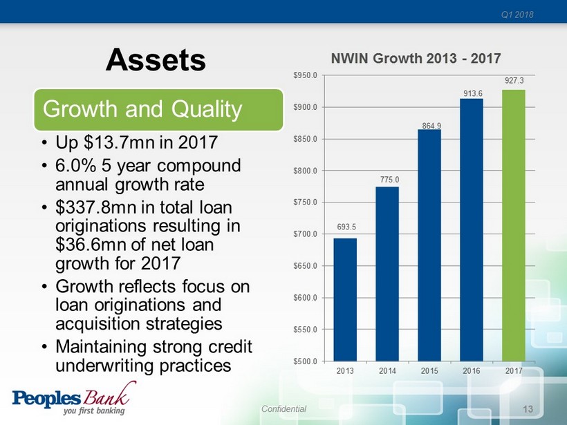 Assets 693.5 775.0 864.9 913.6 927.3 $500.0 $550.0 $600.0 $650.0 $700.0 $750.0 $800.0 $850.0 $900.0 $950.0 2013 2014 2015 2016 2017 NWIN Growth 2013 - 2017 Growth and Quality • Up $13.7mn in 2017 • 6.0% 5 year compound annual growth rate • $337.8mn in total loan originations resulting in $36.6mn of net loan growth for 2017 • Growth reflects focus on loan originations and acquisition strategies • Maintaining strong credit underwriting practices Confidential Q1 2018 13