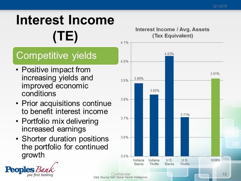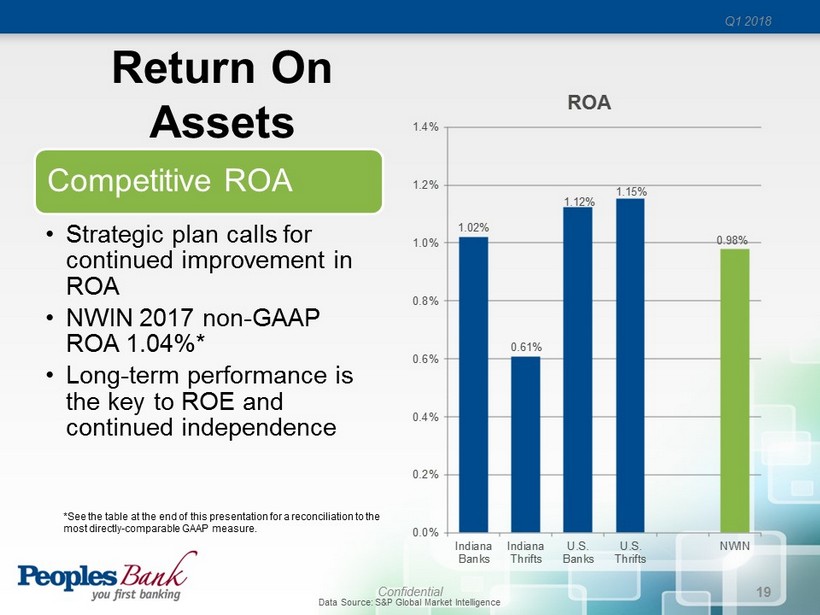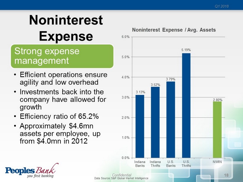 Net Interest Margin (TE) Strong margin • Results of strong funding management • Continues to expand as asset yields improve • Main driver of ROA Data Source: S&P Global Market Intelligence 3.68% 3.73% 3.86% 3.33% 3.84% 2.5% 2.7% 2.9% 3.1% 3.3% 3.5% 3.7% 3.9% 4.1% Indiana Banks Indiana Thrifts U.S. Banks U.S. Thrifts NWIN Net Interest Margin (Tax Equivalent) Confidential Q1 2018 17