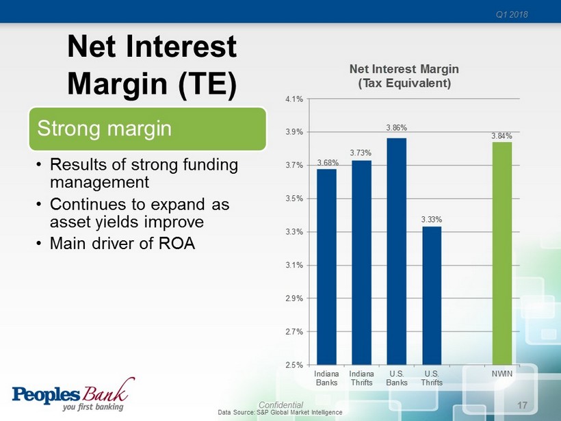Interest Expense Top performer • Strong competitive advantage against peers • Driven by focus on core funds • Consistently lead peers in balance sheet funding Data Source: S&P Global Market Intelligence 0.41% 0.36% 0.43% 0.58% 0.32% 0.0% 0.1% 0.2% 0.3% 0.4% 0.5% 0.6% 0.7% Indiana Banks Indiana Thrifts U.S. Banks U.S. Thrifts NWIN Interest Expense / Avg. Assets Confidential Q1 2018 16