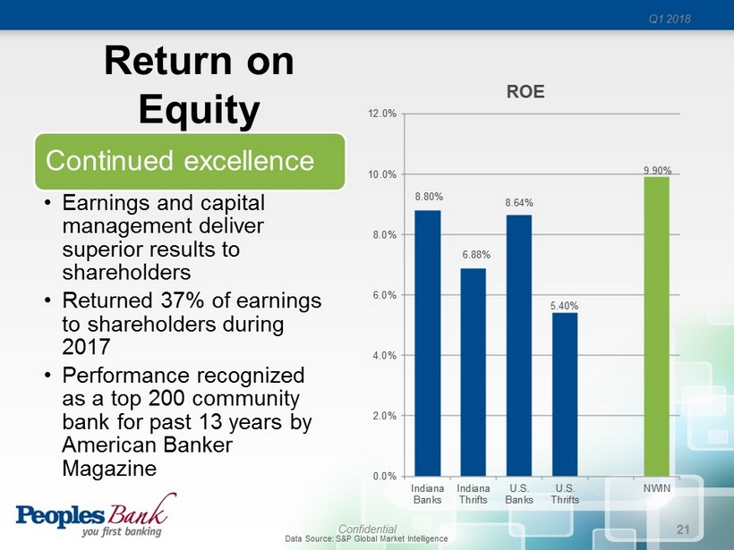 Building Capital 10.0% 9.2% 9.0% 9.2% 9.6% 6.0% 6.5% 7.0% 7.5% 8.0% 8.5% 9.0% 9.5% 10.0% 10.5% Dec 13 Dec 14 Dec 15 Dec 16 Dec 17 NWIN Tier 1 Capital 2013 - 2017 Building capital for growth • Well capitalized at 9.6% tier 1 capital • Deployed capital in 2014 & 2015 through acquisitions • Capital levels support both organic and inorganic growth • Day 1 Tier 1 capital projected at 8.8% with First Personal acquisition Confidential Q1 2018 20