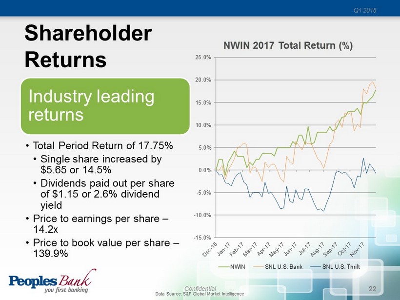 Return on Equity Continued excellence • Earnings and capital management deliver superior results to shareholders • Returned 37% of earnings to shareholders during 2017 • Performance recognized as a top 200 community bank for past 13 years by American Banker Magazine Data Source: S&P Global Market Intelligence 8.80% 6.88% 8.64% 5.40% 9.90% 0.0% 2.0% 4.0% 6.0% 8.0% 10.0% 12.0% Indiana Banks Indiana Thrifts U.S. Banks U.S. Thrifts NWIN ROE Confidential Q1 2018 21