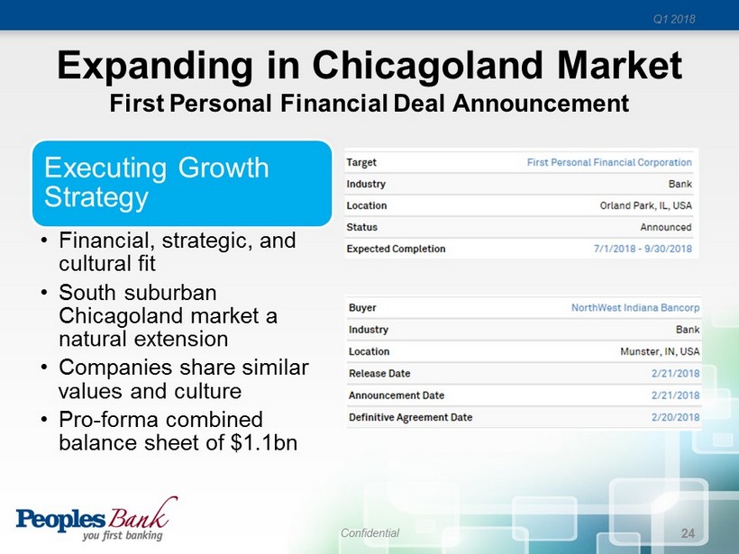 Expanding in Chicagoland Market First Personal Financial Deal Announcement Executing Growth Strategy • Financial, strategic, and cultural fit • South suburban Chicagoland market a natural extension • Companies share similar values and culture • Pro - forma combined balance sheet of $1.1bn Confidential Q1 2018 24