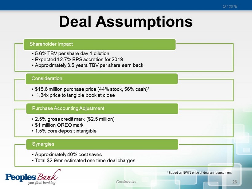 Deal Assumptions • 5.6% TBV per share day 1 dilution • Expected 12.7% EPS accretion for 2019 • Approximately 3.5 years TBV per share earn back Shareholder Impact • $15.6 million purchase price (44% stock, 56% cash)* • 1.34x price to tangible book at close Consideration • 2.5% gross credit mark ($2.5 million) • $1 million OREO mark • 1.5% core deposit intangible Purchase Accounting Adjustment • Approximately 40% cost saves • Total $2.9mn estimated one time deal charges Synergies *Based on NWIN price at deal announcement Confidential Q1 2018 26