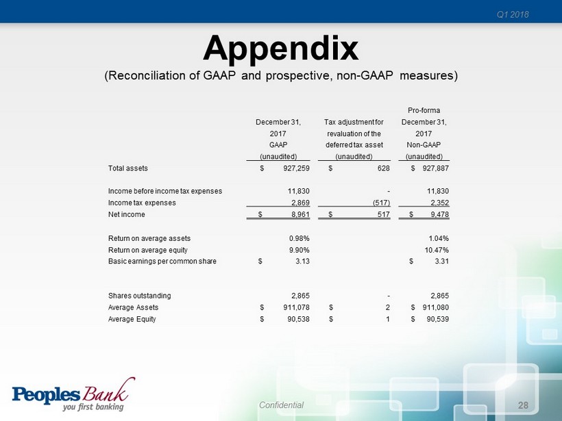 Confidential Q1 2018 Appendix (Reconciliation of GAAP and prospective, non - GAAP measures) Pro - forma December 31, Tax adjustment for December 31, 2017 revaluation of the 2017 GAAP deferred tax asset Non - GAAP (unaudited) (unaudited) (unaudited) Total assets $ 927,259 $ 628 $ 927,887 Income before income tax expenses 11,830 - 11,830 Income tax expenses 2,869 (517) 2,352 Net income $ 8,961 $ 517 $ 9,478 Return on average assets 0.98% 1.04% Return on average equity 9.90% 10.47% Basic earnings per common share $ 3.13 $ 3.31 Shares outstanding 2,865 - 2,865 Average Assets $ 911,078 $ 2 $ 911,080 Average Equity $ 90,538 $ 1 $ 90,539 28