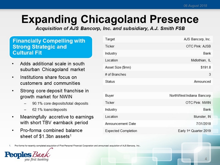 Additional Information For Shareholders In connection with the proposed merger, NorthWest Indiana Bancorp (“NWIN”) will file with the SEC a Registration Statement on Form S - 4 that will include a Proxy Statement of AJSB and a Prospectus of NWIN (the “proxy statement/prospectus”) as well as other relevant documents concerning the proposed transaction. SHAREHOLDERS AND INVESTORS ARE URGED TO READ THE REGISTRATION STATEMENT AND THE PROXY STATEMENT/PROSPECTUS REGARDING THE MERGER WHEN IT BECOMES AVAILABLE AND ANY OTHER RELEVENT DOCUMENTS FILED WITH THE SEC, AS WELL AS ANY AMENDMENTS OR SUPPLEMENTS TO THOSE DOCUMENTS, BECAUSE THEY WILL CONTAIN IMPORTANT INFORMATION. The proxy statement/prospectus and other relevant materials (when they become available) and any other documents NWIN has filed with the SEC, may be obtained free of charge at the SEC’s website at www.sec.gov. In addition, investors and security holders may obtain free copies of the documents NWIN has filed with the SEC from NWIN at www.ibankpeoples.com in the link for “Investor Relations – SEC Filings - Documents.” Alternatively, these documents, when available, can be obtained free of charge from NWIN upon written request to NorthWest Indiana Bancorp, Attn: Corporate Secretary, 9204 Columbia Avenue, Munster, Indiana 46321. The information available through NWIN’s website is not and shall not be deemed part of this presentation or incorporated by reference into other filings NWIN makes with the SEC. This communication does not constitute an offer to sell or the solicitation of an offer to buy any securities or a solicitation of any vote or approval. NWIN and AJSB and certain of their respective directors and executive officers may be deemed to be participants in the solicitation of proxies from the shareholders of AJSB in connection with the proposed merger. Information about the directors and executive officers of NWIN is set forth in NWIN’s Annual Report on Form 10 - K filed with the SEC on February 20, 2018, and in the proxy statement for NWIN’s 2018 annual meeting of shareholders, as filed with the SEC on March 12, 2018. Additional information regarding the interests of these participants in the transaction may be obtained by reading the proxy statement/prospectus regarding the proposed merger when it becomes available. Free copies of this document may be obtained as described in the preceding paragraph. 06 August 2018 3