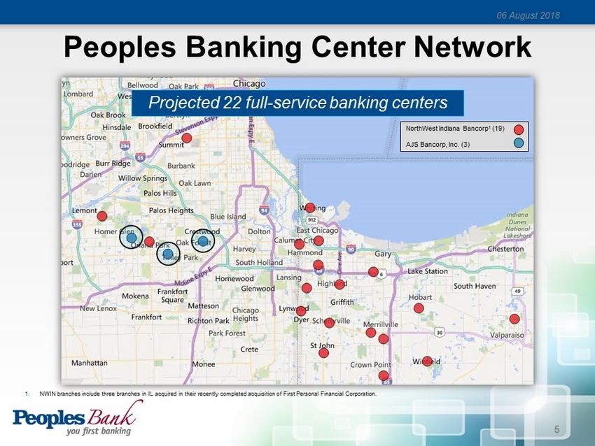 Expanding Chicagoland Presence Acquisition of AJS Bancorp, Inc. and subsidiary, A.J. Smith FSB Financially Compelling with Strong Strategic and Cultural Fit • Adds additional scale in south suburban Chicagoland market • Institutions share focus on customers and communities • Strong core deposit franchise in growth market for NWIN – 90.1% core deposits/total deposits – 62.1% loans/deposits • Meaningfully accretive to earnings with short TBV earnback period • Pro - forma combined balance sheet of $1.3bn assets 1 06 August 2018 4 Target AJS Bancorp, Inc. Ticker OTC Pink: AJSB Industry Bank Location Midlothian, IL Asset Size ($mn) $191.8 # of Branches 3 Status Announced Buyer NorthWest Indiana Bancorp Ticker OTC Pink: NWIN Industry Bank Location Munster, IN Announcement Date 7/31/2018 Expected Completion Early 1 st Quarter 2019 1. Pro - forma for recently completed acquisition of First Personal Financial Corporation and announced acquisition of AJS Bancorp, I nc..