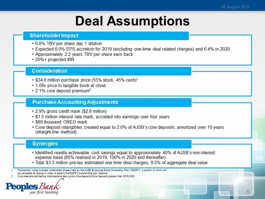 Peoples Banking Center Network Projected 22 full - service banking centers 5 1. NWIN branches include three branches in IL acquired in their recently completed acquisition of First Personal Financial Corpo rat ion. 06 August 2018 NorthWest Indiana Bancorp 1 (19) AJS Bancorp, Inc. (3)