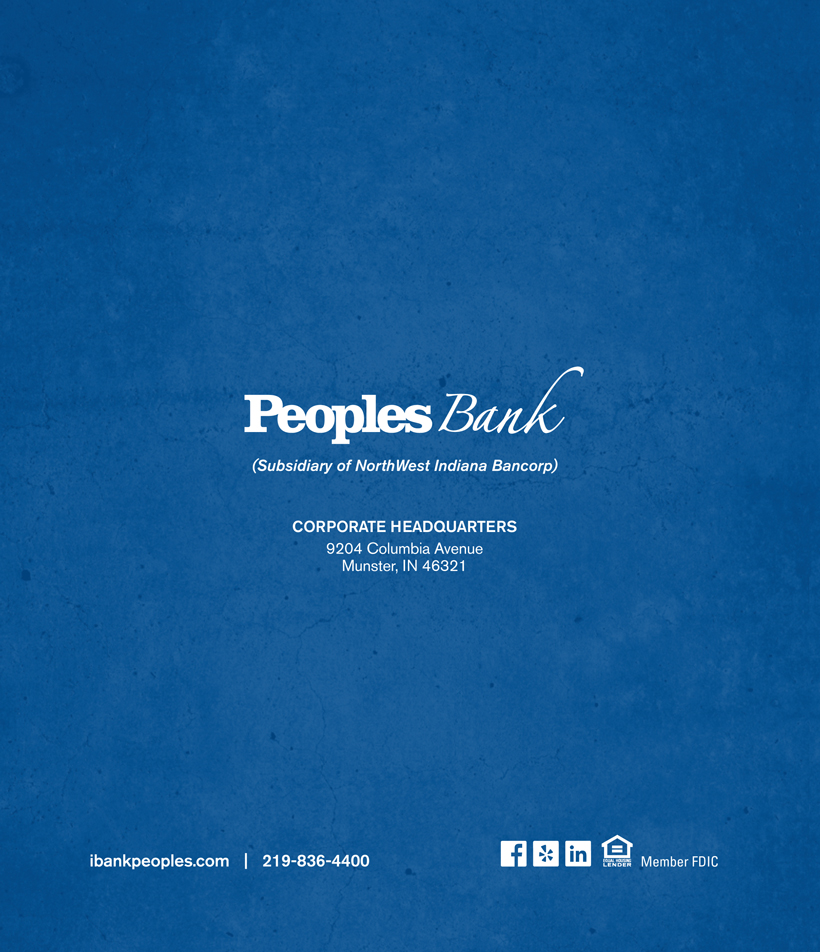 Peoples Bank (Subsidiary of NorthWest Indiana Bancorp) CORPORATE HEADQUARTERS 9204 Columbia Avenue Munster, IN 46321 ibankpeoples.com | 219-836-4400 Member FDIC