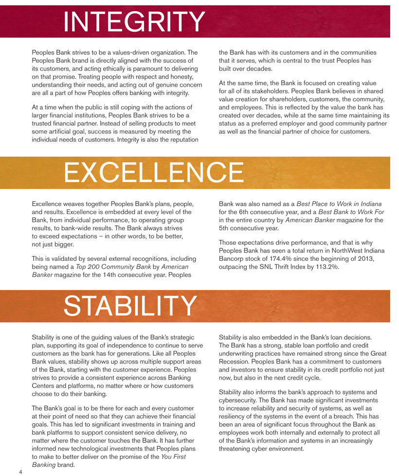 INTEGRITY Peoples Bank strives to be a values-driven organization. The Peoples Bank brand is directly aligned with the success of its customers, and acting ethically is paramount to delivering on that promise. Treating people with respect and honesty, understanding their needs, and acting out of genuine concern are all a part of how Peoples offers banking with integrity. At a time when the public is still coping with the actions of larger financial institutions, Peoples Bank strives to be a trusted financial partner. Instead of selling products to meet some artificial goal, success is measured by meeting the individual needs of customers. Integrity is also the reputation the Bank has with its customers and in the communities that it serves, which is central to the trust Peoples has built over decades. At the same time, the Bank is focused on creating value for all of its stakeholders. Peoples Bank believes in shared value creation for shareholders, customers, the community, and employees. This is reflected by the value the bank has created over decades, while at the same time maintaining its status as a preferred employer and good community partner as well as the financial partner of choice for customers. EXCELLENCE Excellence weaves together Peoples Bank’s plans, people, and results. Excellence is embedded at every level of the Bank, from individual performance, to operating group results, to bank-wide results. The Bank always strives to exceed expectations – in other words, to be better, not just bigger. This is validated by several external recognitions, including being named a Top 200 Community Bank by American Banker magazine for the 14th consecutive year. Peoples Bank was also named as a Best Place to Work in Indiana for the 6th consecutive year, and a Best Bank to Work For in the entire country by American Banker magazine for the 5th consecutive year. Those expectations drive performance, and that is why Peoples Bank has seen a total return in NorthWest Indiana Bancorp stock of 174.4% since the beginning of 2013, outpacing the SNL Thrift Index by 113.2%. STABILITY Stability is one of the guiding values of the Bank’s strategic plan, supporting its goal of independence to continue to serve customers as the bank has for generations. Like all Peoples Bank values, stability shows up across multiple support areas of the Bank, starting with the customer experience. Peoples strives to provide a consistent experience across Banking Centers and platforms, no matter where or how customers choose to do their banking. The Bank’s goal is to be there for each and every customer at their point of need so that they can achieve their financial goals. This has led to significant investments in training and bank platforms to support consistent service delivery, no matter where the customer touches the Bank. It has further informed new technological investments that Peoples plans to make to better deliver on the promise of the You First Banking brand. Stability is also embedded in the Bank’s loan decisions. The Bank has a strong, stable loan portfolio and credit underwriting practices have remained strong since the Great Recession. Peoples Bank has a commitment to customers and investors to ensure stability in its credit portfolio not just now, but also in the next credit cycle. Stability also informs the bank’s approach to systems and cybersecurity. The Bank has made significant investments to increase reliability and security of systems, as well as resiliency of the systems in the event of a breach. This has been an area of significant focus throughout the Bank as employees work both internally and externally to protect all of the Bank’s information and systems in an increasingly threatening cyber environment. 4