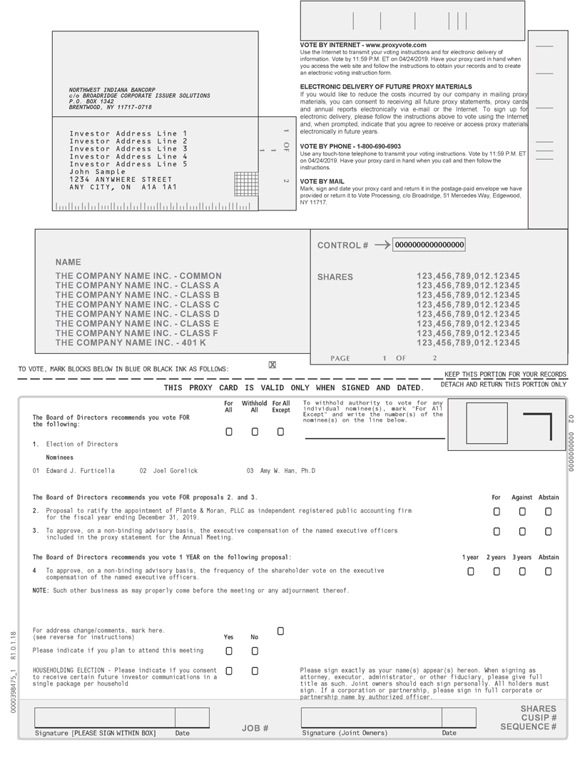 NORTHWEST INDIANA BANCORP c/o BROADRIDGE CORPORATE ISSUER SOLUTIONS P.O. BOX 1342 BRENTWOOD, NY 11717-0718 Investor Address Line 1 Investor Address Line 2 Investor Address Line 3 Investor Address Line 4 Investor Address Line 5 John Sample 1234 ANYWHERE STREET ANY CITY, ON A1A 1A1 1 OF 2 1 1 VOTE BY INTERNET - www.proxyvote.com Use the Internet to transmit your voting instructions and for electronic delivery of information. Vote by 11:59 P.M. ET on 04/24/2019. Have your proxy card in hand when you access the web site and follow the instructions to obtain your records and to create an electronic voting instruction form. ELECTRONIC DELIVERY OF FUTURE PROXY MATERIALS If you would like to reduce the costs incurred by our company in mailing proxy materials, you can consent to receiving all future proxy statements, proxy cards and annual reports electronically via e-mail or the Internet. To sign up for electronic delivery, please follow the instructions above to vote using the Internet and, when prompted, indicate that you agree to receive or access proxy materials electronically in future years. VOTE BY PHONE - 1-800-690-6903 Use any touch-tone telephone to transmit your voting instructions. Vote by 11:59 P.M. ET on 04/24/2019. Have your proxy card in hand when you call and then follow the instructions. VOTE BY MAIL Mark, sign and date your proxy card and return it in the postage-paid envelope we have provided or return it to Vote Processing, c/o Broadridge, 51 Mercedes Way, Edgewood, NY 11717. CONTROL # 0000000000000000 NAME THE COMPANY NAME INC. - COMMON THE COMPANY NAME INC. - CLASS A THE COMPANY NAME INC. - CLASS B THE COMPANY NAME INC. - CLASS C THE COMPANY NAME INC. - CLASS D THE COMPANY NAME INC. - CLASS E THE COMPANY NAME INC. - CLASS F THE COMPANY NAME INC. - 401 K SHARES 123,456,789,012.12345 123,456,789,012.12345 123,456,789,012.12345 123,456,789,012.12345 123,456,789,012.12345 123,456,789,012.12345 123,456,789,012.12345 123,456,789,012.12345 PAGE 1 OF 2 TO VOTE, MARK BLOCKS BELOW IN BLUE OR BLACK INK AS FOLLOWS: KEEP THIS PORTION FOR YOUR RECORDS THIS PROXY CARD IS VALID ONLY WHEN SIGNED AND DATED. DETACH AND RETURN THIS PORTION ONLY For Withhold For All To withhold authority to vote for any All All Except individual nominee(s), mark “For All The Board of Directors recommends you vote FOR the following: Except” and write the number(s) of the nominee(s) on the line below. 1. Election of Directors Nominees 01 Edward J. Furticella 02 Joel Gorelick 03 Amy W. Han, Ph.D The Board of Directors recommends you vote FOR proposals 2. and 3. For Against Abstain 2. Proposal to ratify the appointment of Plante & Moran, PLLC as independent registered public accounting firm for the fiscal year ending December 31, 2019. 3. To approve, on a non-binding advisory basis, the executive compensation of the named executive officers included in the proxy statement for the Annual Meeting. The Board of Directors recommends you vote 1 YEAR on the following proposal: 1 year 2 years 3 years Abstain 4 To approve, on a non-binding advisory basis, the frequency of the shareholder vote on the executive compensation of the named executive officers. NOTE: Such other business as may properly come before the meeting or any adjournment thereof. For address change/comments, mark here. (see reverse for instructions) Yes No Please indicate if you plan to attend this meeting HOUSEHOLDING ELECTION - Please indicate if you consent to receive certain future investor communications in a single package per household Please sign exactly as your name(s) appear(s) hereon. When signing as attorney, executor, administrator, or other fiduciary, please give full title as such. Joint owners should each sign personally. All holders must sign. If a corporation or partnership, please sign in full corporate or partnership name by authorized officer. JOB # SHARES CUSIP # SEQUENCE # Signature [PLEASE SIGN WITHIN BOX] Date Signature (Joint Owners) Date 02 0000000000 0000398475_1 R1.0.1.18