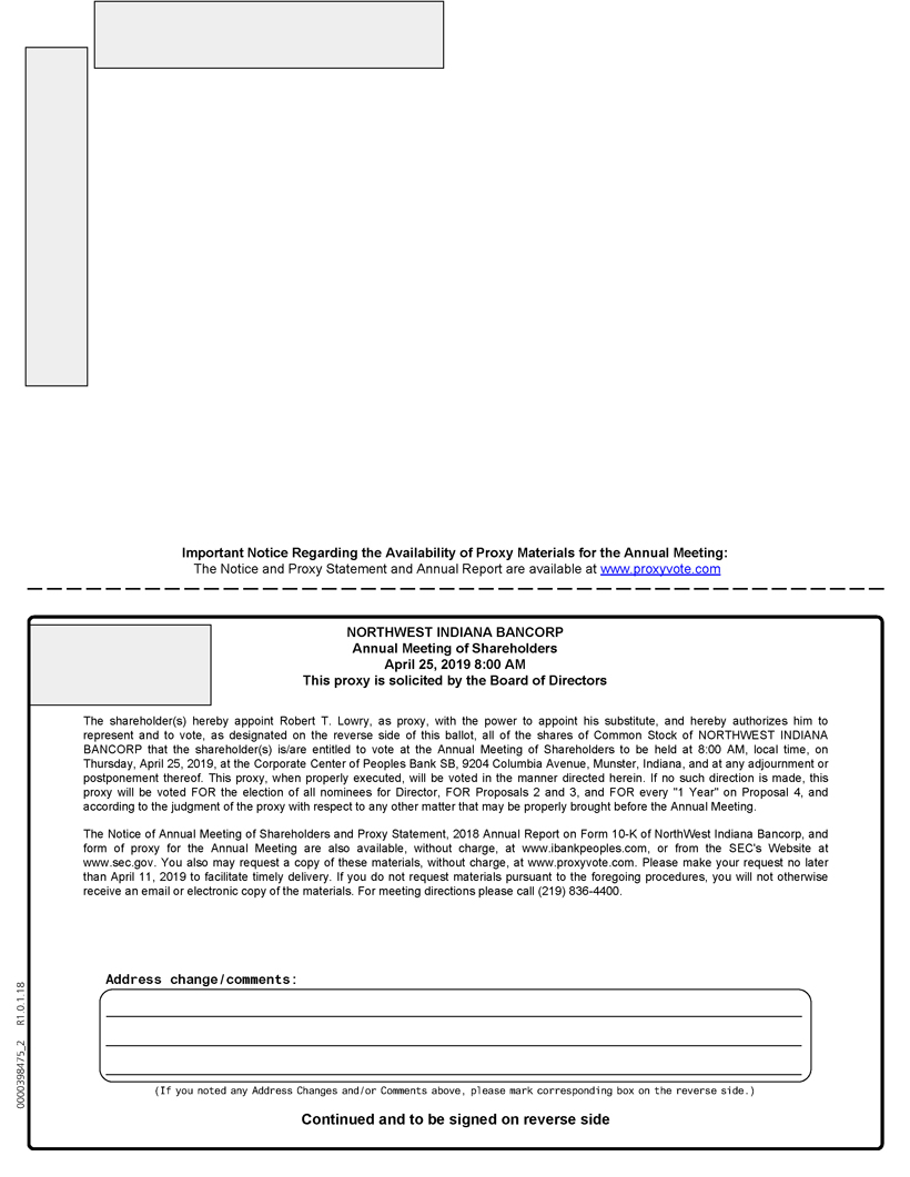 Important Notice Regarding the Availability of Proxy Materials for the Annual Meeting: The Notice and Proxy Statement and Annual Report are available at www.proxyvote.com NORTHWEST INDIANA BANCORP Annual Meeting of Shareholders April 25, 2019 8:00 AM This proxy is solicited by the Board of Directors The shareholder(s) hereby appoint Robert T. Lowry, as proxy, with the power to appoint his substitute, and hereby authorizes him to represent and to vote, as designated on the reverse side of this ballot, all of the shares of Common Stock of NORTHWEST INDIANA BANCORP that the shareholder(s) is/are entitled to vote at the Annual Meeting of Shareholders to be held at 8:00 AM, local time, on Thursday, April 25, 2019, at the Corporate Center of Peoples Bank SB, 9204 Columbia Avenue, Munster, Indiana, and at any adjournment or postponement thereof. This proxy, when properly executed, will be voted in the manner directed herein. If no such direction is made, this proxy will be voted FOR the election of all nominees for Director, FOR Proposals 2 and 3, and FOR every "1 Year" on Proposal 4, and according to the judgment of the proxy with respect to any other matter that may be properly brought before the Annual Meeting. The Notice of Annual Meeting of Shareholders and Proxy Statement, 2018 Annual Report on Form 10-K of NorthWest Indiana Bancorp, and form of proxy for the Annual Meeting are also available, without charge, at www.ibankpeoples.com, or from the SEC's Website at www.sec.gov. You also may request a copy of these materials, without charge, at www.proxyvote.com. Please make your request no later than April 11, 2019 to facilitate timely delivery. If you do not request materials pursuant to the foregoing procedures, you will not otherwise receive an email or electronic copy of the materials. For meeting directions please call (219) 836-4400. Address change/comments: (If you noted any Address Changes and/or Comments above, please mark corresponding box on the reverse side.) Continued and to be signed on reverse side 0000398475_2 R1.0.1.18